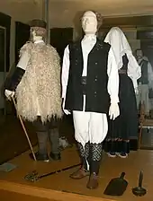 For the males, the national dress usually consists on loose, wide slacks (gaće / širkoke) and a shirt, and both are usually either black or white, or both. The man may wear a decorative or plain vest (fermen or jačerma), over his shirt, and possibly a waistcoat. The man almost always wears a cap, varying in shape and design depending on the region. The most famous cap is perhaps the Lika cap, worn in the Lika region for centuries by the people. Footwear, like the women's, consists mainly on boots and sandals. Because of the weather, certain places often have woolen vests, cloaks, coats, or fur for the colder regions, and silk and light linens for the warmer climates.[1]