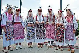 Women tend to wear skirts down to their ankles and a white blouse. Their attire is generally in earth-tones, with white, brown, and black being most common, however, blue dresses and aprons are reserved for married women, while white is for the unmarried ones. Unlike the Croats from the north, the special sandals (opanci) are worn daily. However, liberties are taken with the apron, which is often woven with colorful stitching and patterns with geometric motifs. Multi-colored wool socks (priglavci or nazuvci) with various geometric design are worn over the opanci.[2] For headwear, women wear embroidered kerchiefs or white kerchiefs pinned to their hats. Jewelry such as earrings, bracelets, and necklaces are silver, and necklaces (djerdan) and earrings are often made of silver coins, traditionally from the 19th century Austrian coins (talira).[2]