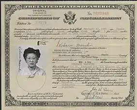 - ↑ Because the status of the parents was irrelevant, except if they were in the employ as part of the military or diplomatic corps of a foreign government or Native American,[26][28] U.S.-born women could pass on their nationality to their children born in the United States,[9] as could parents who themselves were part of a restricted group. For example, the Supreme Court ruled in United States v. Wong Kim Ark (169 U.S. 649, 1898) that children born in the United States to immigrants, who were not eligible for naturalization, were birthright citizens.[29]