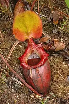 Nepenthes villosa /nɪˈpɛnθiːz vɪˈloʊzə/, or the villose pitcher-plant,[4] is a tropical pitcher plant endemic to Mount Kinabalu and neighbouring Mount Tambuyukon in northeastern Borneo. It grows at higher elevations than any other Bornean Nepenthes species, occurring at elevations of over 3,200 m (10,500 ft). Nepenthes villosa is characterised by its highly developed and intricate peristome, which distinguishes it from the closely related N. edwardsiana and N. macrophylla.[5]