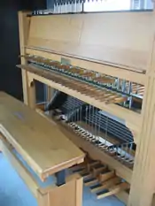 The carillon's bells hang dead in a tower approximately 127 feet (39 m) high, 36 feet (11 m) long, and 25 feet (7.6 m) wide. The original plans had called for the structure to be 270 feet (82 m) tall, but was then reduced after receiving concerns about its height in relationship to the Lincoln Memorial from the Commission of Fine Arts.[1] The tower is an open steel structure reinforced by steel plates and a bronze baked-enamel finish. It was designed by renowned Dutch architect Joost W. C. Boks (1904–1986) and constructed in 1960. At the base of the tower, a rectangular staircase leads to an observation deck 60 feet (18 m) off the ground. From there, a spiral staircase winds further upward to a second observatory 83 feet (25 m) off the ground. The playing cabin sits in the center of the upper observation deck. At the base of the tower, a large inscription reads "From the People of the Netherlands to the People of the United States of America."[3] The interconnecting lines and rectangles of the structure's frame echo the work of Dutch abstract painter Piet Mondrian. The tower's design also reflects the rejection of classical European architecture, which, in the years immediately following World War II, was associated with fascist regimes.[17] The Netherlands Carillon is the first modernist steel memorial associated with the otherwise classical stone architecture found on the National Mall.[18]