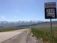 State Route 232 begins in the Clover Valley on Clover Valley Road about five miles (8.0 km) south of Steeles Creek, at the north end of Elko County Route 782.[2] From there, the route travels northward through the desert valley, somewhat paralleling U.S. Route 93 (US 93) to the east, as it traverses near the base of the East Humboldt Range. SR 232 serves a number of ranches and crosses several creeks as it treks northward through Clover Valley. After rounding the east side of Signal Hill, the highway turns eastward. The route comes to an end at a junction with US 93 about 5.5 miles (8.9 km) south of Wells.[3][4]