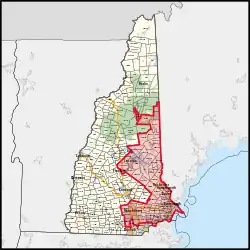 New Hampshire's 1st congressional district covers parts of Southern New Hampshire and the eastern portion of the state. The district contains parts of Hillsborough, Rockingham, Merrimack, Grafton, and Belknap counties; and the entirety of Strafford and Carroll counties.
