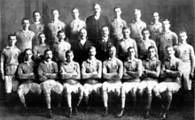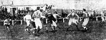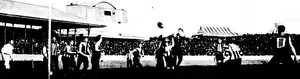 The first Victorian Football League match played in Sydney was with Fitzroy Football Club 7–10, defeating the Collingwood Football Club 6–9 at the Sydney Cricket Ground on 24 May 1903.[25] The large attendance of 20,000 saw the exhibition hailed as a success and inspired the league to continue scheduling more matches in Sydney. However, follow-up matches quickly began to attract cynicism from the Sydney football public, as a VFL push when Geelong Football Club 8.7 (55) defeated Carlton Football Club 6.9 (45) at the SCG a few months later. The matches were seen by the Sydney media as an attempt to force-feed the Victorian game to Sydneysiders who had plenty of rugby to attract their ongoing interest. The crowd of 5,000 was much smaller than those of rugby games in the city.[26] In 1904, Melbourne Football Club 9–17 (71) defeated Essendon Football Club 6–3 (39) in front of 6,000 people.[27] Without any interest, top-level VFL disappeared from Sydney for decades.
