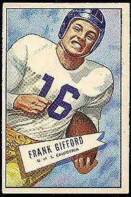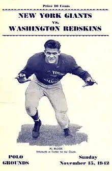 The Giants won their next championship in 1956, the first year the team began playing at Yankee Stadium in the Bronx borough of New York City. Aided by a number of future Pro Football Hall of Fame players such as running back Frank Gifford, linebacker Sam Huff, and offensive tackle Roosevelt Brown, as well as all-pro running back Alex Webster. The Giants' 1956 championship team not only included players who would eventually find their way to the Pro Football Hall of Fame, but a Hall of Fame coaching staff, as well. Head coach Jim Lee Howell's staff had Vince Lombardi coaching the offense and Tom Landry coaching the defense.[20] From 1958 to 1963, the Giants played in the NFL Championship Game five times, but failed to win.[12] Most significantly, the Giants played the Colts in the 1958 NFL Championship Game, which is considered a watershed event in the history of the NFL.[21] The game, which the Giants lost in overtime 23–17,[12] is often called "The Greatest Game Ever Played" and is considered one of the most important events in furthering the NFL's popularity. The following year, they lost the championship to the Colts again, giving up a 9–7 fourth-quarter lead en route to a 31–16 loss.