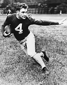 In 1930, there were still many who questioned the quality of the professional game, claiming the college "amateurs" played with more intensity than professionals. In December 1930, the Giants played a team of Notre Dame All Stars at the Polo Grounds to raise money for the unemployed of New York City. It was also an opportunity to establish the skill and prestige of the pro game. Knute Rockne reassembled his Four Horsemen along with the stars of his 1924 Championship squad and told them to score early, then defend. Rockne, like much of the public, thought little of pro football and expected an easy win.[13] But from the beginning it was a one-way contest, with Friedman running for two Giant touchdowns and Hap Moran passing for another. Notre Dame failed to score. When it was all over, Coach Rockne told his team, "That was the greatest football machine I ever saw. I am glad none of you got hurt."[14] The game raised $100,000 for the homeless, and is often credited with establishing the legitimacy of the professional game for those who were critical.[13] It also was the last game the legendary Rockne ever coached; he was killed in an airplane crash on March 31, 1931.
