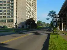 New York State Route 182 (NY 182) is a 6.18-mile (9.95 km) state highway in Niagara County, New York, in the United States. It serves as a signed connection between the Whirlpool Rapids Bridge over the Niagara River and the Niagara Falls International Airport east of the city of Niagara Falls. From the bridge, NY 182 runs across the city of Niagara Falls, following several local streets as it makes its way to an intersection with U.S. Route 62 (US 62) in Wheatfield. The route was originally designated as New York State Route 18D in the early 1930s. It gained its current designation on January 1, 1962.