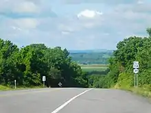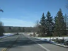 Past the NY 19 junction, US 20A continues east along Buffalo Street to the eastern edge of the village and the valley, where the route turns a full 90 degrees to the north to climb the side of the Oatka Valley. The route ascends approximately 300 feet (91 m),[6] passing under the Rochester and Southern Railroad (RSR)—which runs along the foot of the gorge—before exiting the valley and returning to an east–west alignment as it heads toward Perry and points east. All oversize trucks are prohibited from using the section of US 20A between NY 19 and Minor Road at the top of the valley due to the steep grade of the hill and the sharp curve at the bottom.[7]
