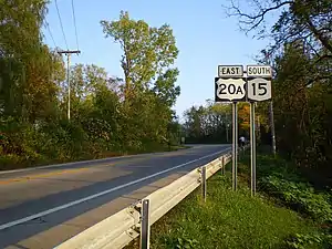 Approaching NY 15A on US 20A westbound near Hemlock. Note the errant NY 20A shield.