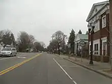 Outside of the village, US 20A becomes Quaker Road, passing through slightly less developed areas as it progresses eastward. Midway between Orchard Park village and East Aurora, US 20A intersects the southern terminus of NY 187 (Transit Road) at the Orchard Park–Aurora town line. Transit Road, however, continues south for one mile (1.6 km) as County Route 553 (CR 553). Farther east, US 20A runs south of Cazenovia Creek for two miles (3.2 km) across open terrain prior to crossing the creek and entering the densely populated village of East Aurora.