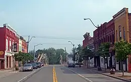 East of the county line, NY 31E becomes Telegraph Road and continues across increasingly less developed areas of Ridgeway. The Erie Canal is visible from most of this section of NY 31E, and about 1 mile (1.6 km) of the highway runs directly alongside the waterway, which curves several times between Middleport and Medina. The two separate at the small hamlet of Shelby Basin, where the route follows a more southerly alignment into a more populated area. Not far to the east is the village of Medina, where NY 31E changes names to West Center Street. The route heads east across the residential western half of the village, passing Prospect Avenue (former NY 63) on its way into Medina's business district. NY 31E passes the village's post office and enter the Main Street Historic District, where NY 31E terminates at NY 31 and NY 63.[3]