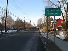 The left turn that brings US 202 into New York and the village of Suffern puts it on Orange Avenue, paralleling the old Main Line of the Erie Railroad past the Suffern train station and into the village's downtown. In the shadow of the New York State Thruway, it meets its first New York state highway, NY 59, and has a brief wrong-way concurrency with it.