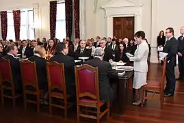The Cabinet secretary and their deputy are the only non-ministers who attend Cabinet meetings.[25] They are not political appointments and their role at Cabinet meetings is to formulate and record the Cabinet's decisions and advise on procedure, not to offer policy advice.[26] The secretary has a dual role as the clerk of the Executive Council where they provide a channel of communication and liaison between the Cabinet and the governor-general.[27][28]