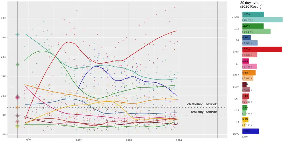 Pollster Fieldwork dates Sample size TS–LKD LVŽS DP LSDP LP LRLS LLRA−KŠS LRP TTS LT DSVL Lead