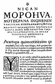 - ↑ The text's full title is Huei tlamahuiçoltica omonexiti in ilhuicac tlatocaçihuapilli Santa Maria totlaçonantzin Guadalupe in nican huei altepenahuac Mexico itocayocan Tepeyacac ("By a great miracle appeared the heavenly queen, Saint Mary, our precious mother of Guadalupe, here near the great altepetl of Mexico, at a place called Tepeyacac")