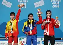 Karasakal (right) with Katherin Oriana Echandia Zarate and Nguyễn Thị Thu Trang at the 2018 Summer Youth Olympics