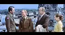 The movie's exteriors were filmed on location in Berlin, while interiors were filmed at the Geiselgasteig Studios in Munich over a five-week period in the summer of 1953, at a cost of $800,000, shot in the new wide-screen format of Cinemascope.[11] Filming was sometimes made difficult by the tensions existing in Berlin between the United States and the Soviet Union. In one scene filmed near the Brandenburg Gate with realistic props, the film crew came under close scrutiny by numerous armed Russians suspicious of the activity.[6] Filming was complete by October.[15]