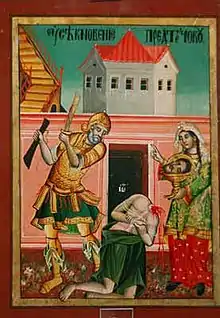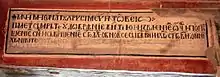 In the lowest section are represented life size figures of saints. In the middle section we see Christ's miracles while in the upper parts of the church are representations of Passion. The inscriptions are in Greek and Church Slavonic of Serbian redaction.[5]