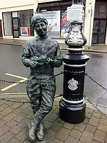 Many of the racing scenes in the film were performed by motorcycling riders from the Isle of Man such as brothers Bertie and Harold Rowell.[7] They were paid £75 per day for their appearances.[4] Members of the Peveril Motor Cycle Club also carried out some of the stunts, including Cyril Standen who crashed into the front-door of the Ballacraine Hotel and the crash into the river at Sulby.[8] Jack Cannell also featured as a stunt rider wearing bib number 15.