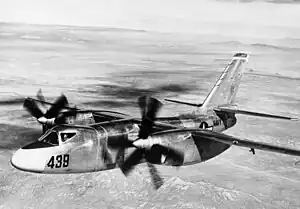 The A2J was essentially an enlarged AJ Savage with the two reciprocating engines replaced with two Allison T40 turboprop engines and removal of the tail-mounted turbojet. Like the AJ, it was a high-winged monoplane with unswept wings. The wings were fitted with leading edge slats and large trailing edge flaps, and folded outside of the engine nacelles to ease storage aboard ship. It had a crew of three: pilot, co-pilot/bombardier, and gunner who sat in a pressurised cabin in the nose of the aircraft. Up to 10,500 lb (4,800 kg) of bombs could be carried in a large enclosed bomb-bay in the center fuselage, while the planned defensive armament was a remotely controlled tail turret with two 20 mm cannon.[3]