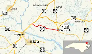 North Carolina Highway 137 (NC 137) is a 8.6-mile-long (13.8 km) highway entirely in Gates County, North Carolina. NC 137 runs from NC 37 in Gatesville to US Highway 13/US Highway 158 (US 13/US 158) north of Winton.