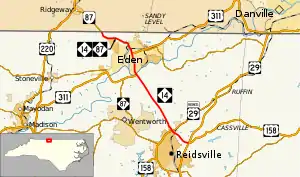 The four roads pass through eastern Eden as Van Buren Road along a commercial strip as a five-lane arterial road. It interchanges with Meadow Road at a partial cloverleaf interchange, where US 311 and NC 770 exit off to the east and NC 700 begins east. NC 14 and NC 87 narrow to two lanes and begin to curve to the west, intersecting many of the city's streets and paralleling the Smith River. Northwest of the city, the road intersects a former alignment of NC 87. At the Virginia state line, NC 87 and NC 14 end and the road becomes VA 87 to continue to Ridgeway, Virginia, south of Martinsville, Virginia.[1][2]