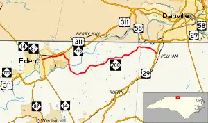 Rockingham | Eden | 0.0– 0.1 | 0.0– 0.16 | ![]() ![]() ![]() ![]() ![]() ![]() | Interchange; west end of NC 770 overlap |
