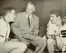 Later that month, December 28–30, the first annual Dixie Classic tournament was held in Reynolds. The Dixie Classic was a three-day tournament held each December until 1961 that matched the four Tobacco Road schools of NC State, North Carolina, Duke, and Wake Forest against four of the top teams from across the country. In its time the Dixie Classic became the largest regular season tournament in college basketball.[22] After finishing the season at 27–6 and winning its fourth consecutive Southern Conference tournament, the Wolfpack received invitations to both the National Invitation Tournament and the NCAA Division I men's basketball tournament. Case declined the NIT bid and accepted the invitation to the program's first ever NCAA Tournament.[23] The team defeated Holy Cross before losing to eventual champion City College of New York, 78–73. NC State went on to defeat Baylor in the third-place game, 53–41.[17] The Wolfpack won its fifth consecutive Southern Conference title in 1951 and its sixth the following year. Both seasons ended in early exits from the NCAA Tournament, though. In 1951 State defeated Villanova in the first round before losing to Illinois. In 1952 the team lost in the first round to St. John's and future North Carolina head coach Frank McGuire.