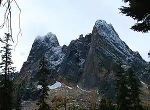Liberty Bell Mountain from 5,477-foot (1,669 m) elevation Washington Pass on North Cascades Highway