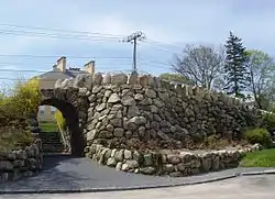 The district's most sophisticated architectural elements are in its public buildings, and in the estates of the Ames family. Early examples include the Gothic Revival architecture of Queset, possibly designed by Andrew Jackson Downing and built about 1854, and Langwater, a Second Empire house built in 1859. Most notable, however are five buildings designed by H. H. Richardson in his signature Richardsonian Romanesque style, which were designed a National Historic Landmark District in 1987. These include the Ames Free Library and Oakes Ames Memorial Hall, sited on a parcel landscaped by Frederick Law Olmsted, the Old Colony Railroad Station, the Ames Gate Lodge, and the F. L. Ames Gardener's Cottage.[2]