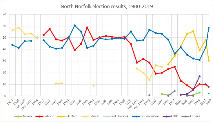 Formerly held by Labour from 1945 to 1970, then the Conservatives from 1970 to 2001, the seat was represented by the Liberal Democrat Norman Lamb from 2001 until he stood down for the 2019 general election, when the Conservatives regained the seat from the Lib Dems with a swing of 17.5%.