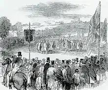 To start the construction work, there was an official sod-cutting ceremony. This took place in September 1846[17] The site chosen for the ceremony was a field in Etruria. A roped off enclosure for directors was created and the remainder of the field was reserved for invited guests. A mile-long procession headed by John Lewis Ricardo, Member of Parliament for Stoke-on-Trent and chairman of the NSR Company, formed. On Ricardo's arrival, the crowds broke through the roped off area and Ricardo was pushed and shoved. During the actual cutting he buckled the silver spade and had difficulty removing the sod. Finally, his hat blew away.[18]