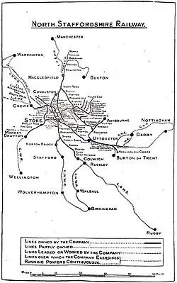 The company was based in Stoke-on-Trent and was nicknamed The Knotty;[2] its lines were built to the standard gauge of 4 ft 8+1⁄2 in (1,435 mm). The main routes were constructed between 1846 and 1852 and ran from Macclesfield via Stoke to Colwich Junction joining the Trent Valley Railway, with another branch to Norton Bridge, just north of Stafford, and from Crewe to Egginton Junction, west of Derby. Within these main connections with other railway companies, most notably the London and North Western Railway (LNWR), the company operated a network of smaller lines although the total route mileage of the company never exceeded 221 miles (356 km). The majority of the passenger traffic was local although a number of LNWR services from Manchester to London were operated via Stoke. Freight traffic was mostly coal and other minerals but the line also carried the vast majority of china and other pottery goods manufactured in England.