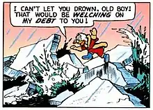 Scrooge is then left with the choice of either getting his bag back or saving Barko. Scrooge dodges over the ice to save his friend instead of saving his fortune ("I can't let you drown, old boy! That would be welching on my debt to you!"). All seems lost as Scrooge and Barko are stranded on the cracks of ice, but then the boys and Poly Poly show up to save the day. Poly Poly swims with Scrooge and his sled dog back to land, but the celebration is cut short as Slick grabs the receipt. Before he can rip it and steal Scrooge's great fortune, news reporters show up, taking his photo for the court to see.