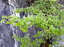 Nothofagus gunnii, the tanglefoot or deciduous beech, is a deciduous shrub or small tree endemic to the highlands of Tasmania, Australia. It was described in 1847 by R.C Gunn[2] N. gunnii is a small woody tree with a shrubby appearance known to grow up to 8 metres (26 ft). It lives only on mountains due to temperature limitations within the Tasmanian maritime climate and mainly grows at altitudes greater than 800 metres (2,600 ft) above sea level.[2] It grows in alpine and sub-alpine regions in the central portions of the island. Though capable of reaching the size of a small tree, it is most common as a thick shrub or woody ground cover, hence its common name of "tanglefoot".