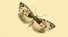 The wingspan is 14–20 mm. The forewings have a slightly arched costa , the fold reaching middle. The ground colour is rosy whitish, sometimes ochreous-tinged, sometimes striated with fuscous. The costa is strigulated with dark fuscous. The basal patch is fuscous or ferruginous-brown, black-marked, its edge nearly straight. The central fascia is ill-defined, grey or ferruginous, with a black posterior subdorsal projection . The apical area is streaked with ferruginous and leaden-metallic, marked with black. The hindwings are whitish fuscous. The larva is reddish-brown ; head light brown ; plate of 2 black[4]