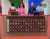 The members of the winning team competed against each other in the Semi-Finals, facing a board with four rows of 16 blanks each.[1] Narz read a crossword-style clue, after which the letters of the answer were filled in one at a time as he said "letter," starting at the far left end of the top row. Either contestant could buzz-in at any time; a correct answer scored one point and completed the word, but a miss gave the opponent a free guess before Narz resumed filling in the letters. If the word was not solved before its last letter was revealed, neither contestant scored. Each word after the first overlapped its predecessor by at least one letter; when the row became too full to accommodate any more words, play continued with a new word on the next row down.