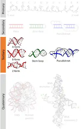 Nucleic acid tertiary structure is the three-dimensional shape of a nucleic acid polymer.[1] RNA and DNA molecules are capable of diverse functions ranging from molecular recognition to catalysis. Such functions require a precise three-dimensional structure. While such structures are diverse and seemingly complex, they are composed of recurring, easily recognizable tertiary structural motifs that serve as molecular building blocks. Some of the most common motifs for RNA and DNA tertiary structure are described below, but this information is based on a limited number of solved structures. Many more tertiary structural motifs will be revealed as new RNA and DNA molecules are structurally characterized.