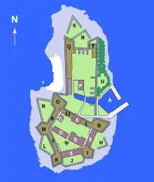 A: Harbour, B: Tower and church, C: Corps de Garde, D: Commandant's Quarters, E: Headquarters, F: Well, G: North Star Bastion, H: Prince Frederick Ravelin, I: Dolphin' Bastion, J: Beach Battery, K: Mermaid Bastion, L: Rosenlund Ravelin, M: Whale Bastion, N: Woodstore Ravelin, O: Lobster Bastion, P: Hospital, Q: West Corner, R: Smithy Ravelin, S: Stone Glacis, T: East Corner, U: Commandant's Garden
