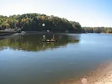 The reservoir can be accessed by Interstate 95, which has attracted fishing recreational activities on the lake since 1961. Largemouth bass, bluegill, black and white crappie, channel catfish, flathead catfish, northern pike, and white perch are fished on the lake despite some pollution problems.[3] The Occoquan Boat Club (OBC), founded in 1979 by Rick Evans, is a major boating club located on the reservoir, organizing rowing, sponsoring crew races, sending teams to regattas, and advocating rowing in Northern Virginia. The OBC has 180 members and has over 19 shells, recognizable by their red and black striping on the bow.[4] The club operates singles, doubles, sweep fours and sculling quads rowing sessions on the lake.