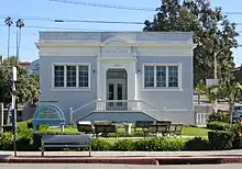 In December 1916, the commissioners of Santa Monica selected the site for the Ocean Park branch Carnegie library at 2601 Main Street.[5] The library was funded by a $12,500 grant from the Carnegie Corporation. The library was completed on February 15, 1918 when it was opened to the public. The library is one of the remaining pieces of the Carnegie legacy in Southern California. During World War II, the basement of the library was converted to a Young People's room for teens. It served as a temporary United Service Organizations (USO) location during the war. The city Landmarks Commission designated it as a Santa Monica historic landmark on May 3, 1977. [6]