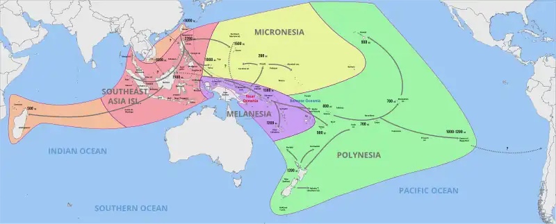 Chronological dispersal of Austronesian people across the Pacific (per Bellwood in Chambers, 2008)