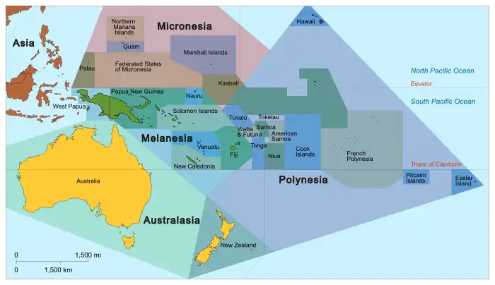 Oceania with its sovereign states and dependent territories within the subregions Australasia, Melanesia, Micronesia, and Polynesia