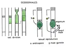 The Oedogoniales are an order of filamentous freshwater green algae of the class Chlorophyceae.[1] The order is well-defined and has several unique features, including asexual reproduction with zoospores that possess stephanokont flagella: numerous short flagella arranged in a subapical whorl.[1] The oedogoniales have a highly specialized type of oogamy, and an elaborate method of cell division which results in the accumulation of apical caps.