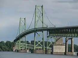 The Ogdensburg–Prescott International Bridge (also known as the St. Lawrence Bridge and the Seaway Skyway) is a suspension bridge connecting Ogdensburg, New York in the United States to Johnstown, Ontario (a few kilometres east of Prescott) in Canada. Designed by Modjeski & Masters and completed in 1960, it has six spans and a main span of 350.75 metres (1,150.8 ft) totaling 2.4 kilometres (1.5 mi) across the Saint Lawrence River and Saint Lawrence Seaway.[2] The bridge is owned and operated by the Ogdensburg Bridge and Port Authority, which also owns and operates Ogdensburg International Airport, the Port of Ogdensburg-Marine Terminal Facility, Commerce Park, the Port of Waddington, a medium-heavy industrial park and two short line railroads. The Ogdensburg Bridge and Port Authority is a New York State public-benefit corporation.[3][4]