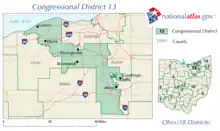 It was one of several districts challenged in a 2018 lawsuit seeking to overturn Ohio's congressional map as an unconstitutional gerrymander.[4] According to the lawsuit, the 13th resembles a "jigsaw puzzle piece" that reaches out to grab the portion of Akron not taken in by the Cleveland-based 11th district.[5]