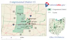 The 15th congressional district of Ohio is currently represented by Republican Mike Carey. It was represented by Republican Steve Stivers from 2011 until May 16, 2021, when he resigned to become president and CEO of the Ohio Chamber of Commerce.[3] The district includes all of Franklin County that is not in the 3rd district, including Grove City, Hilliard, and Dublin. It then fans out to grab suburban and exurban territory between the state capital Columbus and Dayton, along with more rural territory south of Columbus.
