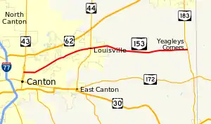 State Route 153 (SR 153) is a 14.69-mile (23.64 km) long east–west state highway in the northeastern portion of the U.S. state of Ohio. The western terminus of SR 153 is at a signalized intersection with southbound SR 43 in Canton, along a stretch of SR 43 where that highway is divided into a one-way couplet. SR 153 has its eastern endpoint at SR 183 nearly 4 miles (6.4 km) south of Alliance.