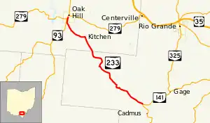 State Route 233 (SR 233) is an east–west state highway in the southeastern portion of Ohio, a U.S. state. The western terminus of State Route 233 is at a signalized intersection in Oak Hill where it meets the duplex of State Route 93 and State Route 279. The eastern terminus of this state route is at a T-intersection with State Route 141 in the heart of the Wayne National Forest approximately 4 miles (6.4 km) northwest of the unincorporated community of Patriot.