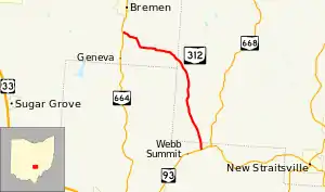 State Route 312 (SR 312) is a north–south state highway located in the southern portion of the U.S. state of Ohio. SR 312 runs from its southern terminus at a T-intersection with SR 93 approximately 4.25 miles (6.84 km) northeast of Logan to its northern terminus at a T-intersection with SR 664 nearly 1.25 miles (2.01 km) south of Bremen.